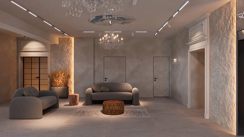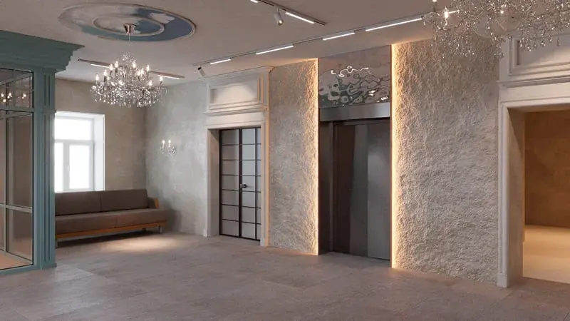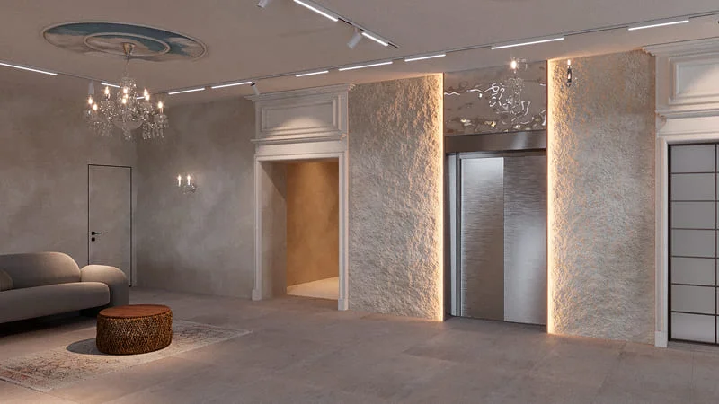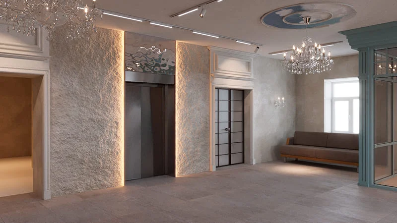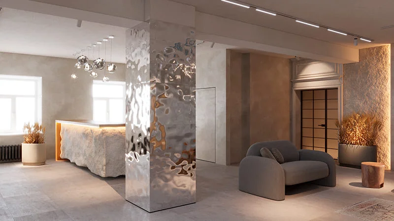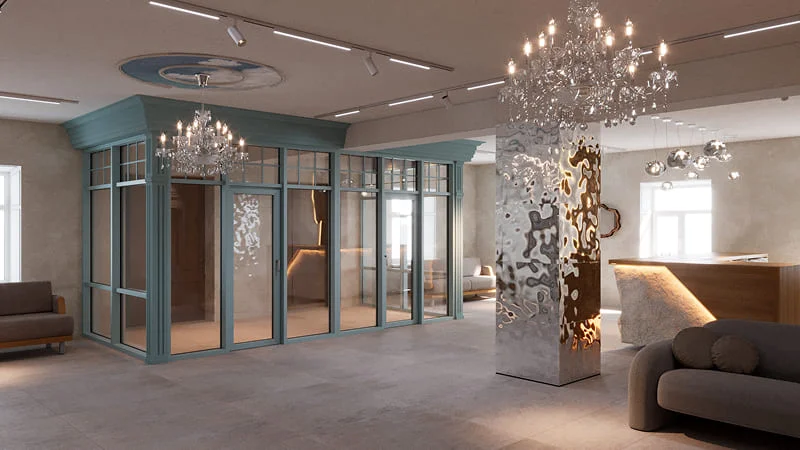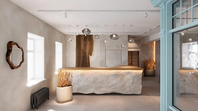 Зона приветствия гостей, общее пространство для отеля, СПА-комплекса и кофейни